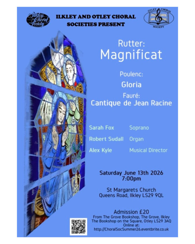 Tickets available from The Grove bookshop Ilkley and The Bookshop on the Square Otley and online at Eventbrite https://ChoralSocSummer26.eventbrite.co.uk
